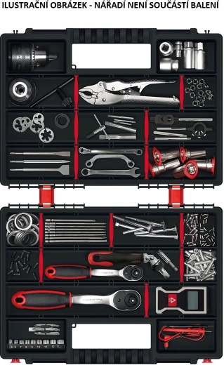 Az átlátszó fedél időt takarít meg – mindent első pillantásra lát, felnyitás nélkül. Az ellenálló műanyag védi a tárolt anyagokat, a masszív zárak szállítás közben is a helyükön tartják a tartalmat, az ergonomikus fogantyú pedig kényelmes kezelést garantál. Kompakt méretei miatt jól használható műhelyben, szervizautóban és otthoni garázsban is.