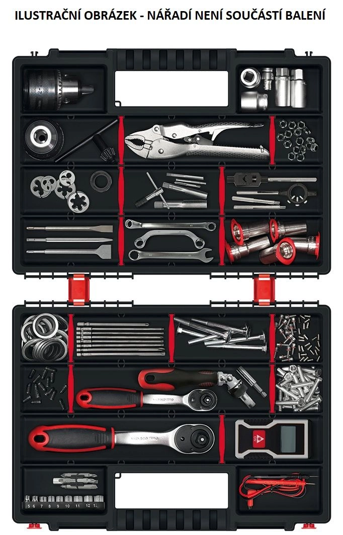 A praktikus NORS DUO műanyag rendező két, könnyen szétválasztható tálcát kínál összesen 44 állítható rekesszel csavarokhoz, szegekhez, kapcsokhoz és egyéb apróságokhoz. A átlátszó fedélnek köszönhetően azonnal áttekintheti a tartalmat, míg a masszív zárak és az ergonomikus fogantyú biztonságos és kényelmes hordozást biztosítanak. Ideális műhelybe, garázsba és hobbiprojektekhez.