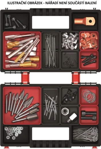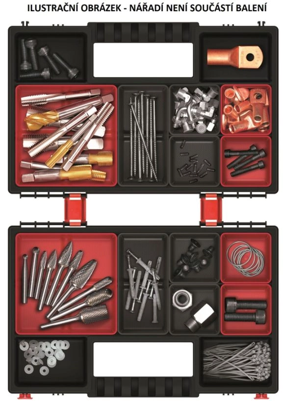 Mindegyik rendező 6 kivehető rekeszt tartalmaz, amelyeket az aktuális igények szerint rendezhet. A masszív zárak és az ergonomikus fogantyú biztos fogást és biztonságos szállítást nyújtanak, míg a tartós polimer keverékből készült ház bírja a mindennapos használatot a műhelyben és az építkezésen is.