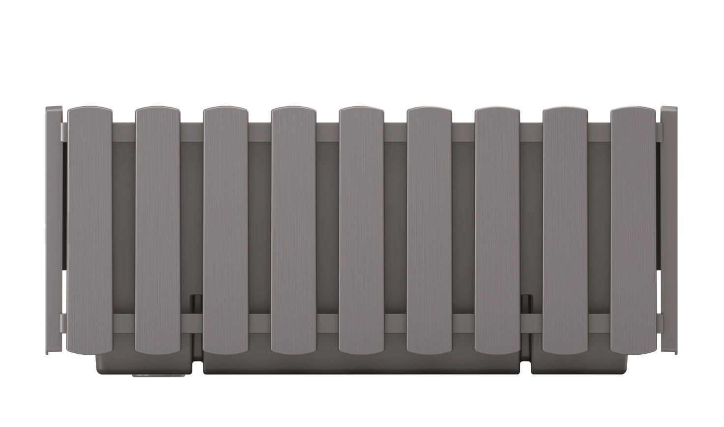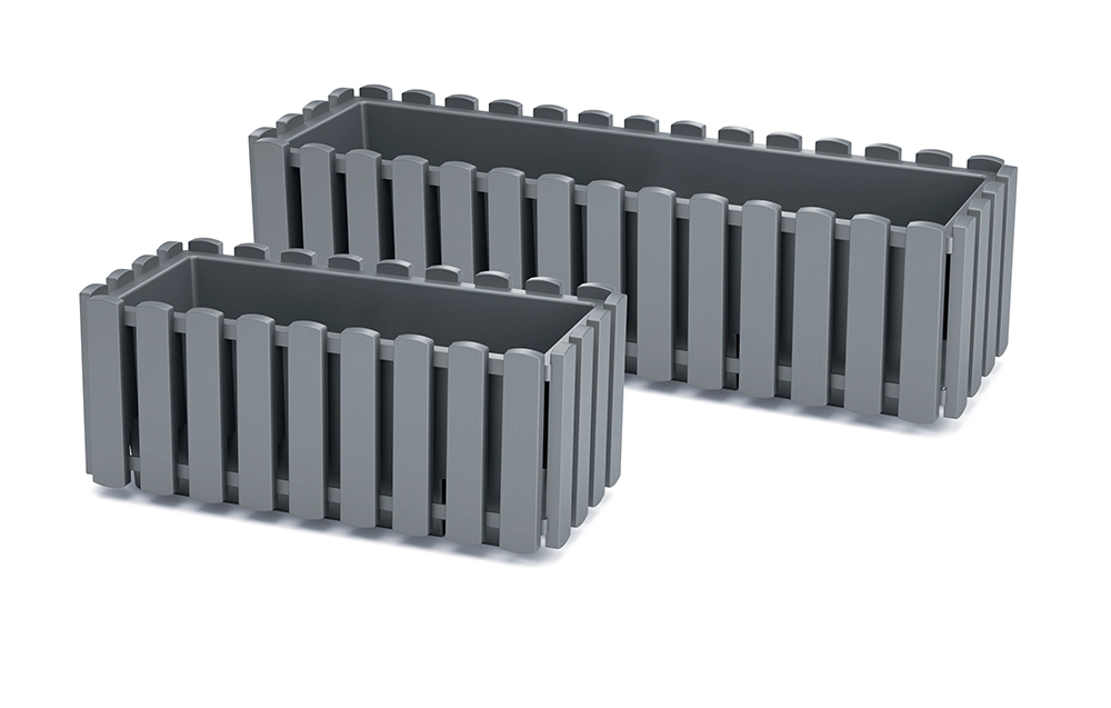 Sokoldalú műanyag ládika modern szürke kő árnyalatban, amely a fa lécek dekorját az ellenálló anyag praktikusságával ötvözi. Ablakpárkányra, erkélyre, teraszra és beltérre egyaránt alkalmas, UV-stabilizálása révén hosszú távon is megőrzi színét fakulás nélkül.