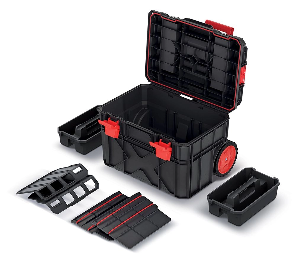 A teleszkópos fogantyúnak és a nagy, protektoros elasztomer kerekeknek köszönhetően az egyenetlen felületen is könnyű a mozgatás. A belső tér kivehető tartókkal és válaszfalakkal rugalmas elrendezést tesz lehetővé a szerszámok és tartozékok számára, így minden kéznél és biztonságosan rögzítve marad.