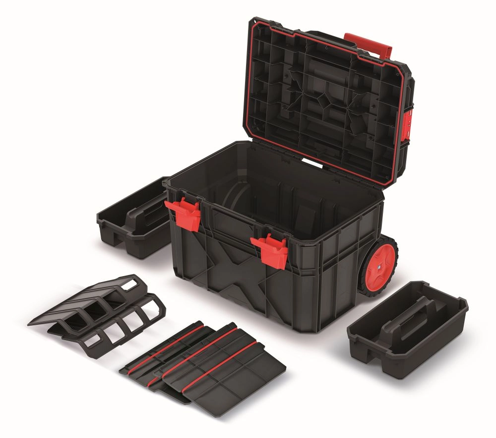 A X‑BLOCK TECH sorozat robusztus szerszámos koffere szállítókerekekkel profi felhasználásra, megterhelő körülményekhez tervezve. Moduláris összekapcsoló rendszert kínál, a tömítésnek köszönhetően magas por- és vízállóságot, akár 50 kg teherbírást, valamint a modul közvetlen terhelhetőségét 120 kg-ig. A fedél „G” befogósínekkel és alumínium vezetősínekkel van felszerelve, így munkapaddá alakítható.