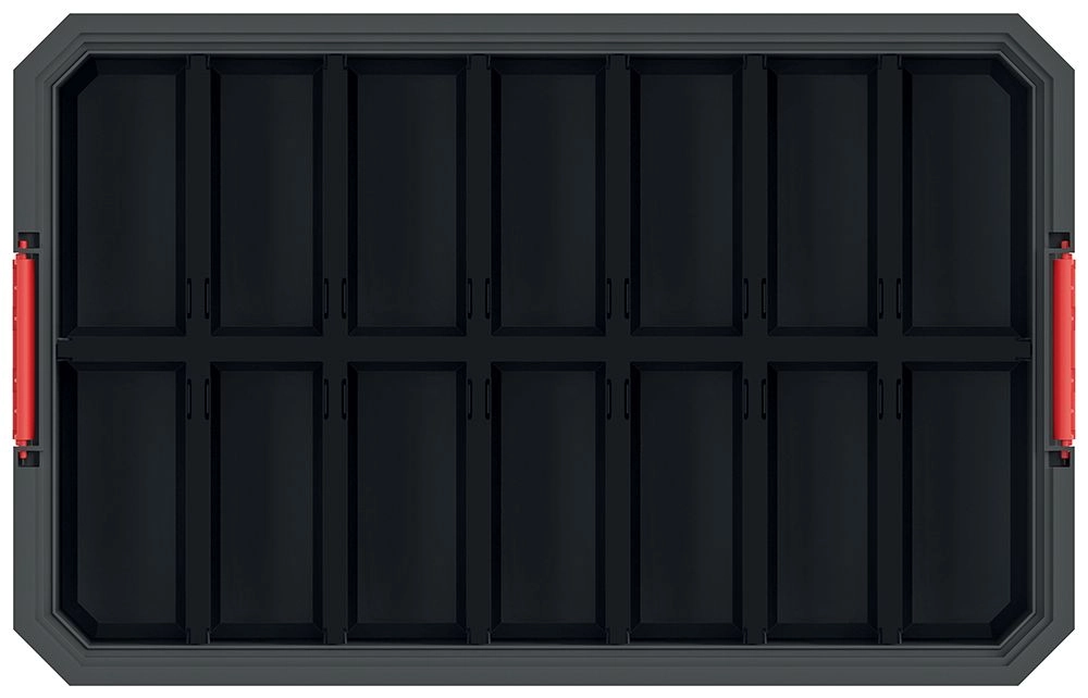 Megerősített falak és erős, piros reteszek tartják biztonságban a tartalmat még gyakori szállítás mellett is. Ideális szerszámokhoz és anyagokhoz megterhelő munkakörnyezetben.