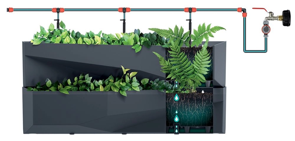 A felesleges víz az alsó virágtartókba csorog, egyenletesebb nedvességet biztosítva. Csepegtető öntözéssel tovább bővíthető a még kényelmesebb gondozásért.