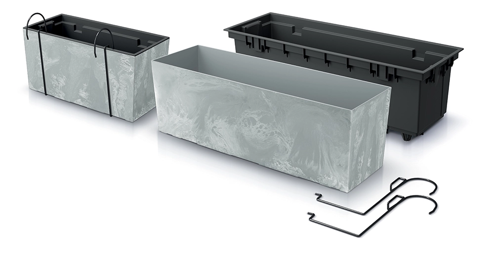 Stílusos, betonhatású balkonláda, amely modern akcentust ad a beltérnek és a kültérnek egyaránt. Könnyű, mégis UV-sugárzással és időjárási hatásokkal szemben ellenálló, és a praktikus kampóknak és betétnek köszönhetően könnyen felszerelhető és karbantartható. Méretei elegendő helyet biztosítanak különféle növények számára, univerzális marengo színe pedig a legtöbb dekorációhoz illik.
