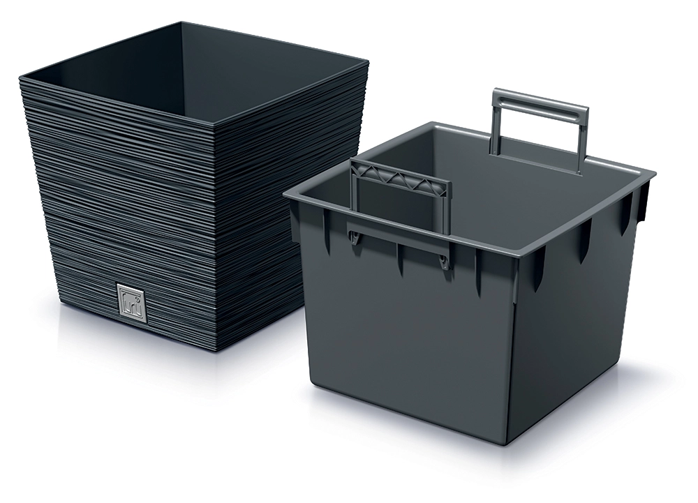 A külső kaspó és a belső, lehajtható fogantyús betét rendszere lehetővé teszi a növények gyors kiemelését és a kényelmes karbantartást.