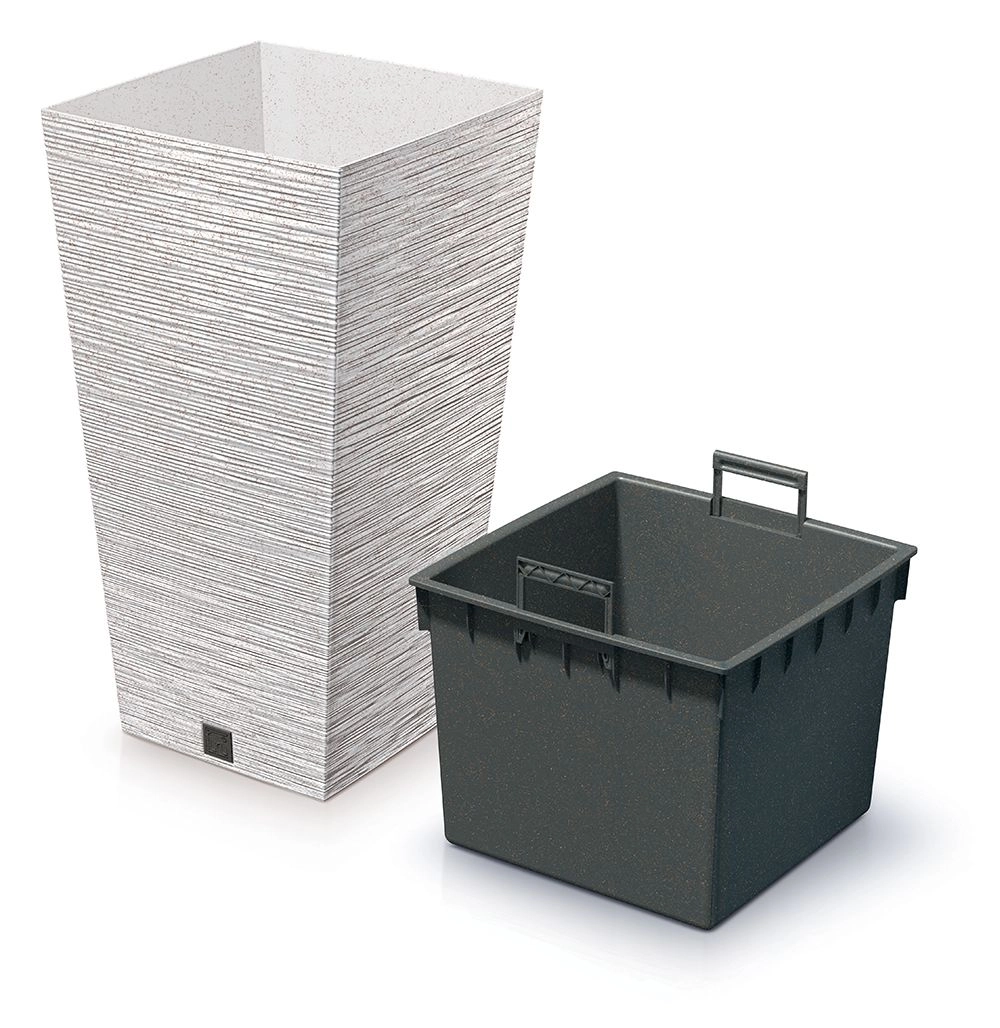 Stílusos ültetőedény az Eco Wood kollekcióból modern, szögletes kivitelben, amely a fa megjelenését és a praktikus betétet a könnyű ültetéshez ötvözi. Könnyű, tartós, beltérre és kültérre egyaránt alkalmas, elegáns fehér színben.