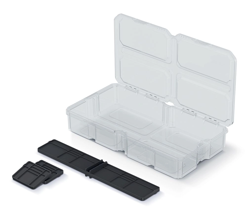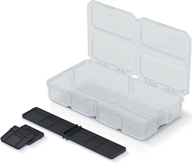 A praktikus, átlátszó kivitelű MSX BOX rendező a átlátszó fedélnek köszönhetően gyors rálátást biztosít a tartalomra, és rugalmas rendszerezést kínál 3 kivehető elválasztóval. Könnyen hordozható, strapabíró műanyagból készült, és ideális apró alkatrészek, csavarok vagy szögek tárolására.