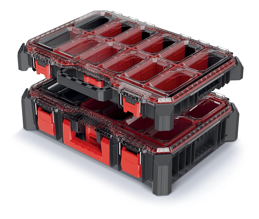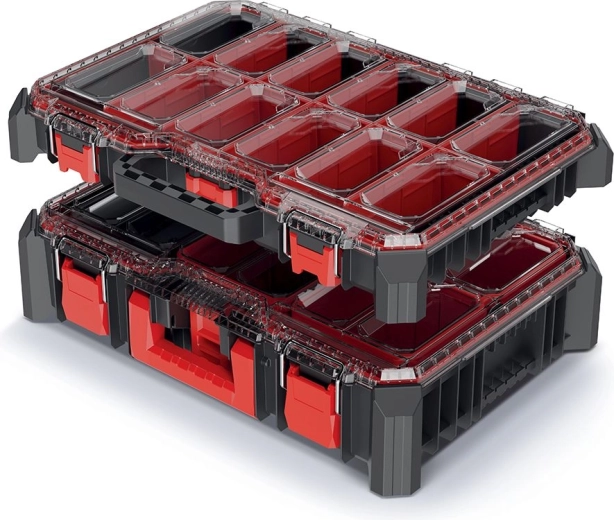 Két darabból álló, praktikus, elegáns fekete rendszerezőkészlet szerszámok, kötőelemek és apró alkatrészek átlátható tárolásához. Ideális műhelybe, garázsba és otthonra. Masszív kivitel, átlátható rekeszek és kompakt méret: 54,3 × 39 × 20 cm a rendre és a gyors hozzáférésre.