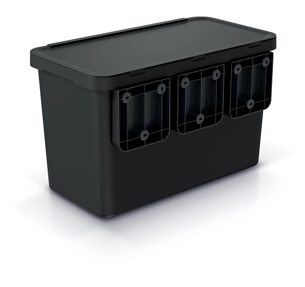 Praktikus, otthoni szelektív hulladékgyűjtő két, 10 és 23 literes tartállyal a hulladék kényelmes elkülönítéséhez. Újrahasznosított műanyagból készült, felülete ellenáll az alkoholnak, zsíroknak és olajoknak, a kényelmes ABS fogantyúk pedig megkönnyítik a használatot. Padlóra helyezhető vagy falra szerelhető, így helyet takarít meg, és a elegáns fekete színnek és a praktikus moduláris kialakításnak köszönhetően bármely belső térbe remekül illeszkedik.