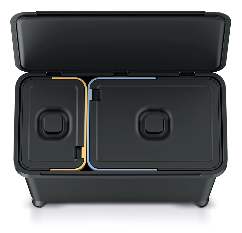 Hatékony hulladékválogatás kompromisszumok nélkül. A két, különálló edény (10 l + 23 l) lehetővé teszi a hulladék kényelmes szétválasztását típus szerint. A masszívan integrált ABS fogantyúknak köszönhetően a kezelés, kiürítés és tisztítás maximálisan egyszerű. A modern, újrahasznosított fekete szín és a letisztult vonalak garantálják, hogy nem bontják meg a konyha, fürdőszoba vagy iroda megjelenését.