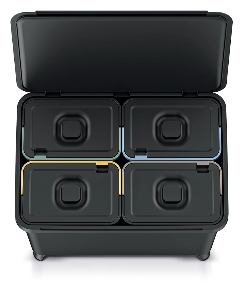 A négy darab, egyenként 10 literes betét színes peremmel rendelkezik a hulladék gyors megkülönböztetéséhez. A kivehető edények fogantyúkkal könnyítik a kiürítést és a karbantartást.