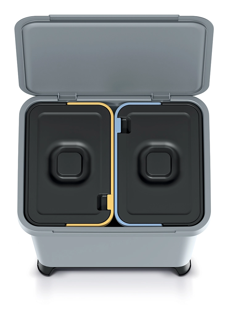 A két kivehető betét praktikus fogantyúkkal gyorsan elválasztja a műanyagot, papírt és a vegyes hulladékot, és megkönnyíti a kiürítést.