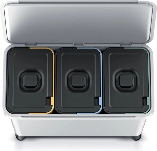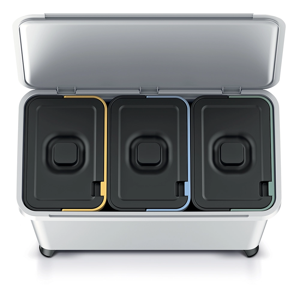 Három, egyenként 10 l-es kivehető belső kosár színes fedelekkel felgyorsítja a válogatást és rendet tart egy helyen.
