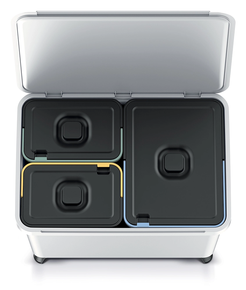 Az elegáns, hamuszürke PROSPERPLAST Systema szelektív szemetes ötvözi a funkcionalitást és a helytakarékosságot. A három, színnel jelölt kivehető tartály bőséges helyet biztosít a mindennapi hulladéknak, és kompromisszumok nélküli, átlátható szelektálást kínál.