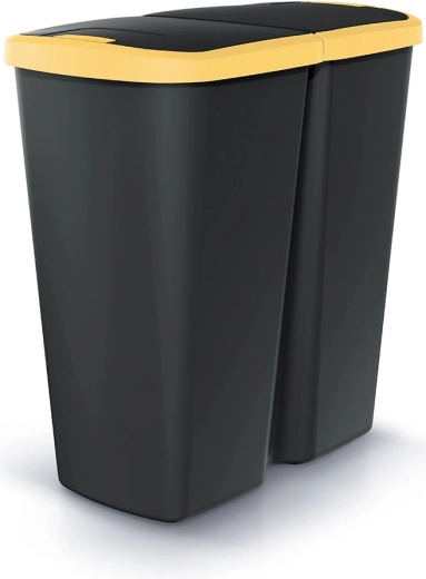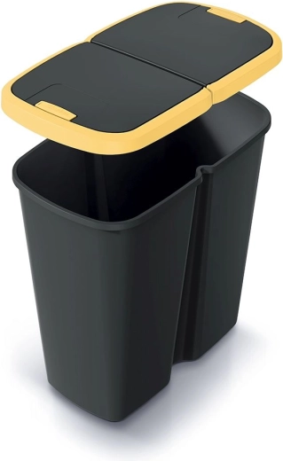 Kompakt méreteinek köszönhetően a kuka kisebb konyhákba vagy irodai sarkokba is befér, mégis elegendő, 45 literes kapacitást kínál. A tartós műanyag szerkezet könnyen tisztítható, a fekete test sárga fedéllel illik a modern enteriőrökhöz, és egyben segíti a vizuális megkülönböztetést a szelektálás során.