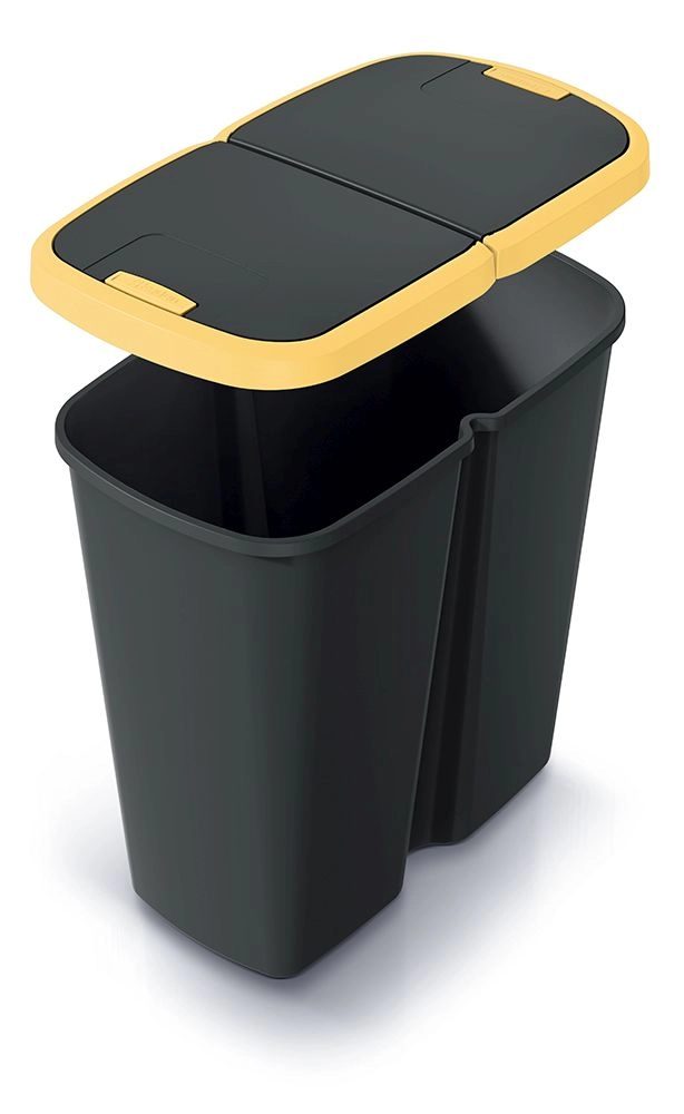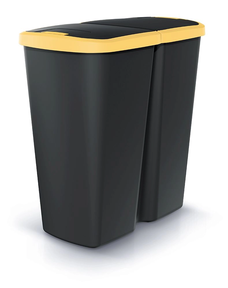 Praktikus, 45 literes szemetes dupla fedéllel, amely könnyű szelektálást kínál otthon és irodában. A gombnyomásos nyitásnak köszönhetően a kezelés kényelmes és higiénikus, míg a strapabíró műanyag és a kompakt méretek hosszú élettartamot és helytakarékosságot biztosítanak. A kontrasztos sárga fedél megkönnyíti a vizuális megkülönböztetést szelektáláskor.