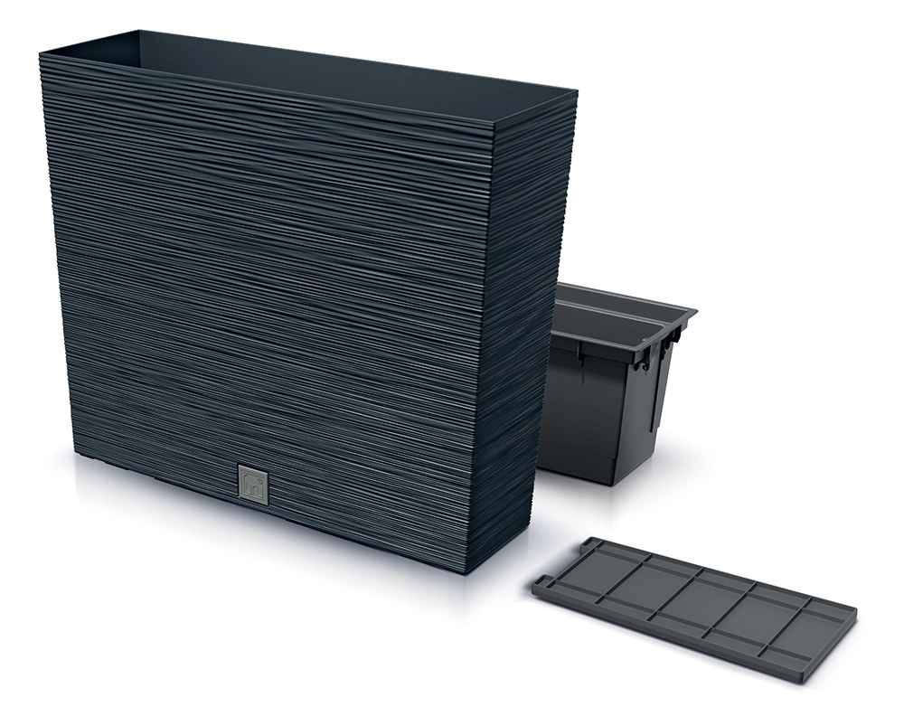 A csomag része a kivehető belső betét (12 l) csepegtetőtálcával a hatékony vízelvezetéshez és a könnyű ültetéshez. A öntözőrendszer stabil páratartalmat tart fenn a közegben, ami jót tesz a virágoknak, fűszernövényeknek és kisebb díszfüveknek.
