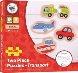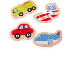Ez a fa puzzle-készlet négy közkedvelt közlekedési eszközt tartalmaz, amelyeket a gyerekek két erős darabból könnyedén kirakhatnak. Az egyszerű formák, az élénk színek és a kellemes fa kivitel ösztönzi az ismételt játékot, és természetes módon támogatja a beszédfejlődést, az alak- és színfelismerést, valamint a koncentrációt.