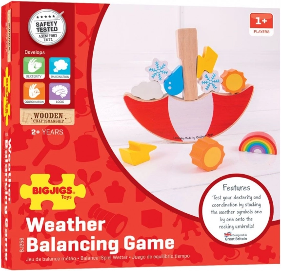 Milyen magasra tudod kiegyensúlyozni az időjárás-elemeket? Ez a lebilincselő egyensúlyozó játék ötvözi a szórakozást és a tanulást: a gyerekek fejlesztik a koordinációt és a logikus gondolkodást, miközben különböző formájú és súlyú darabokat helyeznek a billegő esernyőre. Minden lépés összpontosítást és finom mozdulatokat igényel – az utolsó sikeres játékos nyer!
