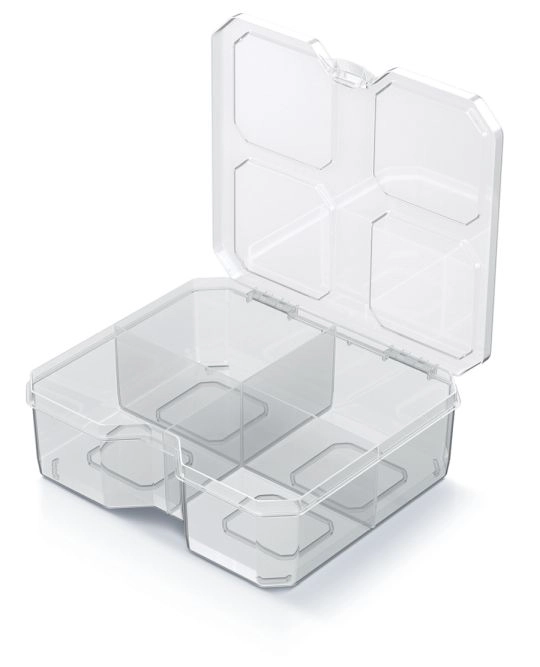 A praktikus SQR box rendező 15,6 × 14 × 5 cm méretben áttekinthető tárolást kínál apróságokhoz otthon, irodában és műhelyben. A átlátszó kivitelnek köszönhetően gyorsan megtalálja, amire szüksége van, felnyitás nélkül. A négy masszív rekesz és az ellenálló elválasztók biztonságosan a helyükön tartják a csavarokat, gemkapcsokat és egyéb apróságokat, míg a könnyű műanyag ház megkönnyíti a kezelést és a hordozást.