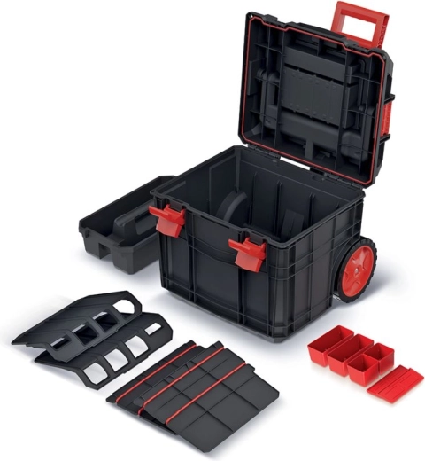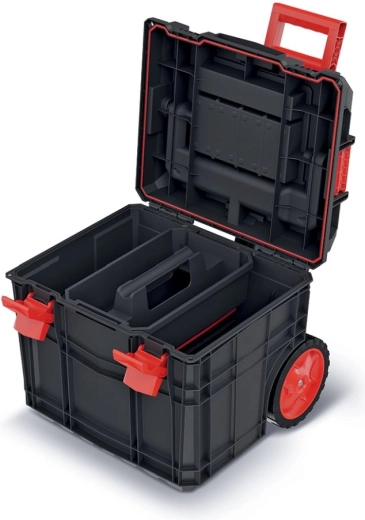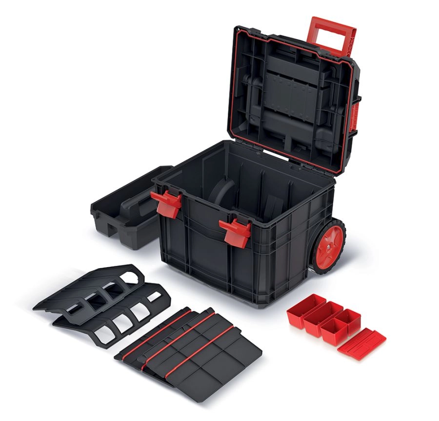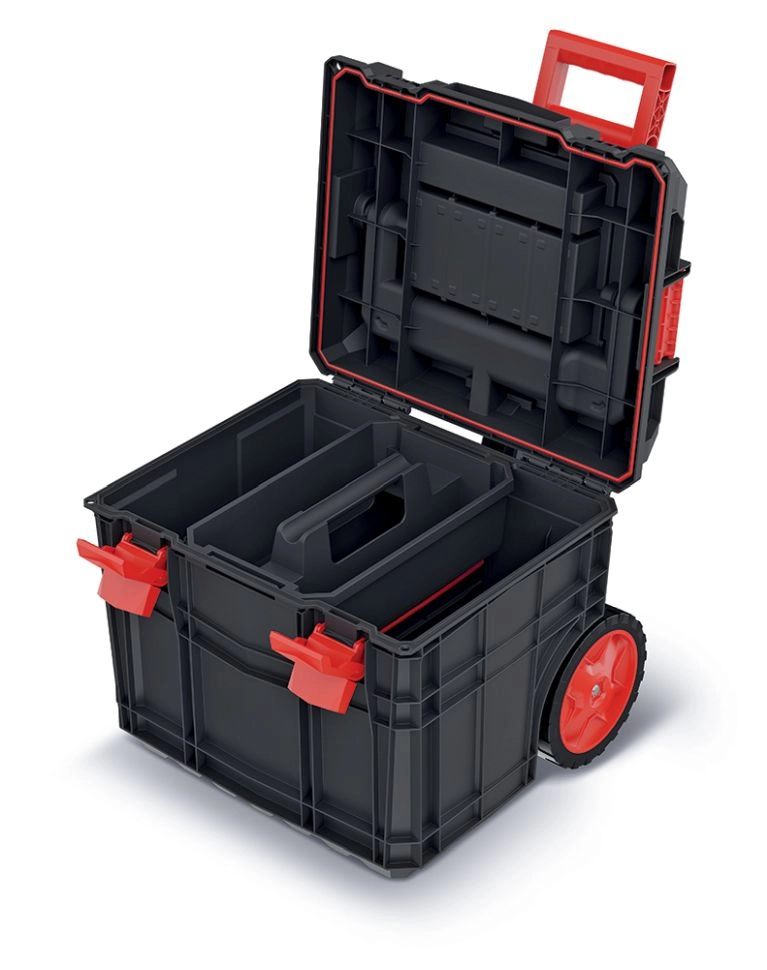Két kivehető rekesz, kis dobozok és szerszámtartók gondoskodnak a jól áttekinthető rendszerről. A hely könnyen az aktuális igényekhez igazítható.