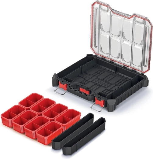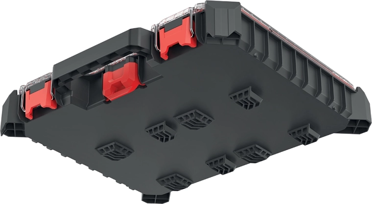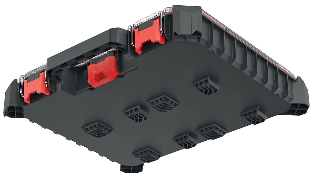 A belső teret 10 kivehető doboz alkotja, amelyek könnyen az aktuális igényekhez igazíthatók. Az átlátszó polikarbonát fedél első pillantásra lehetővé teszi a tartalom ellenőrzését, míg az erős tömítés véd a por és a víz ellen. A fém zsanérok és a fém elemekkel erősített ABS zárak nagyfokú tartósságot biztosítanak.