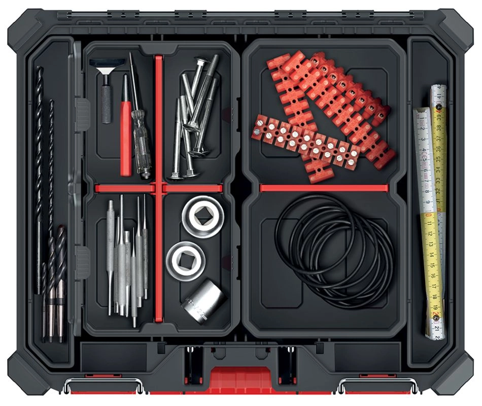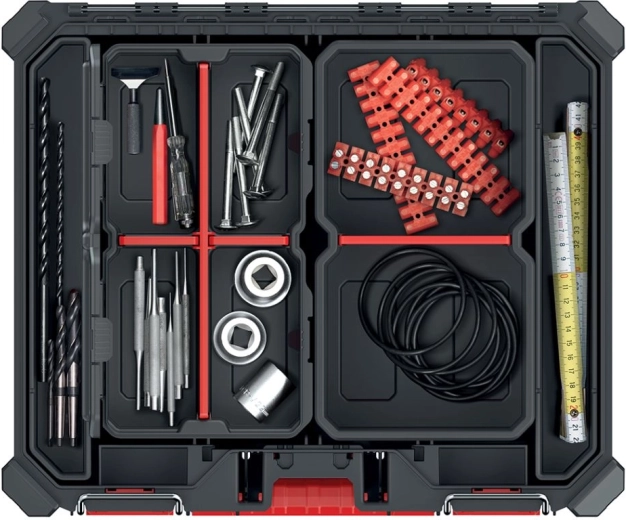 A belső teret igényeihez igazíthatja – 6 kivehető tartály és 4 kivehető válaszfal áll rendelkezésre. A fém zsanérok és a tartós ABS műanyag reteszek növelik az élettartamot és a biztonságot szállítás közben. A strapabíró polimer ház bírja a mindennapos igénybevételt, és védi a benne tárolt felszerelést az ütésektől.