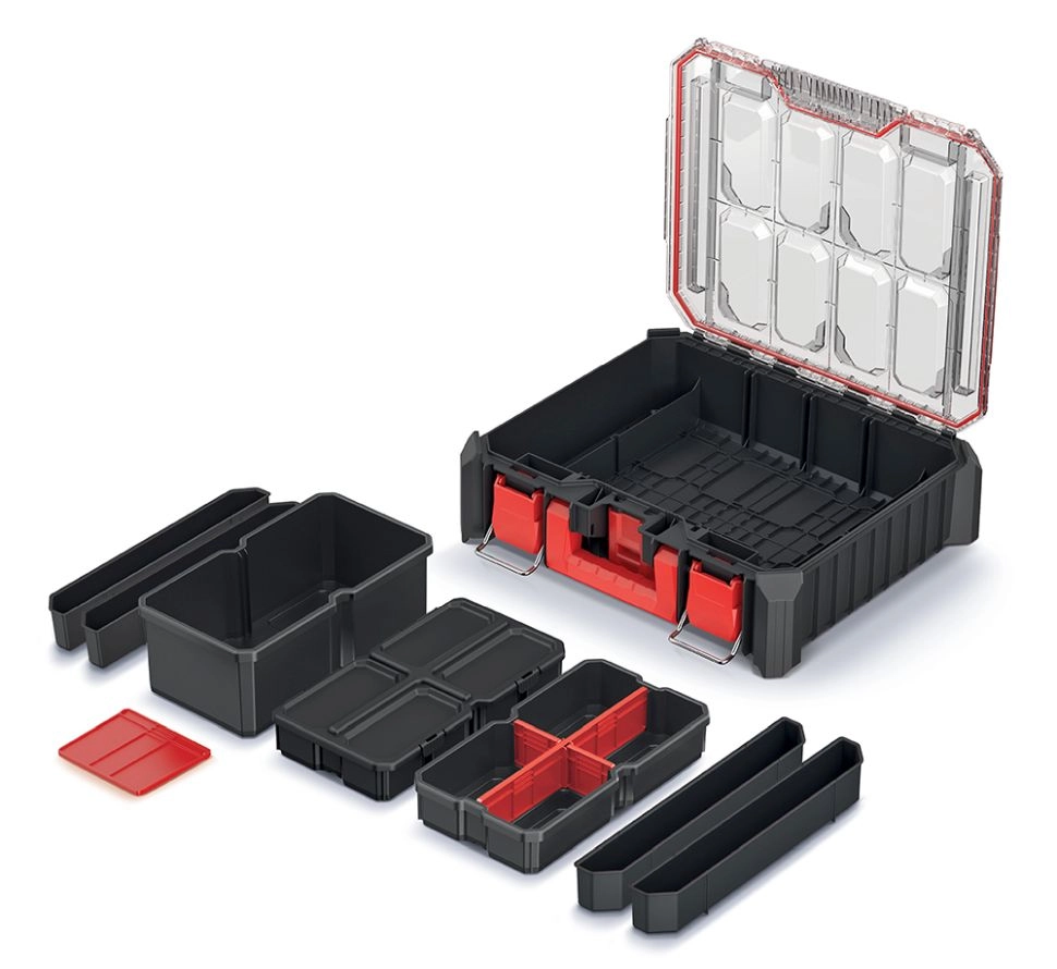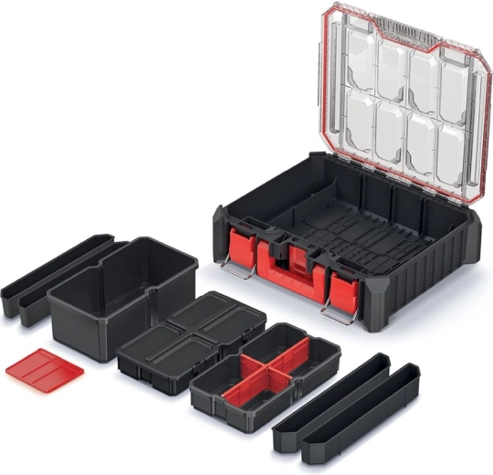 Praktikus szerszámszervező 44,5 × 36,8 × 12,6 cm méretben, masszív kivitelben, átlátszó polikarbonát fedéllel és por- és vízálló tömítéssel. A 6 kivehető tartály és a 4 válaszfal révén könnyen személyre szabhatja a belső elrendezést. A fém zsanérok és a masszív ABS reteszek megbízható és biztonságos tárolást garantálnak még igényes körülmények között is.