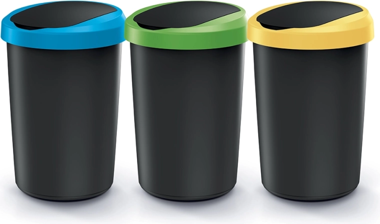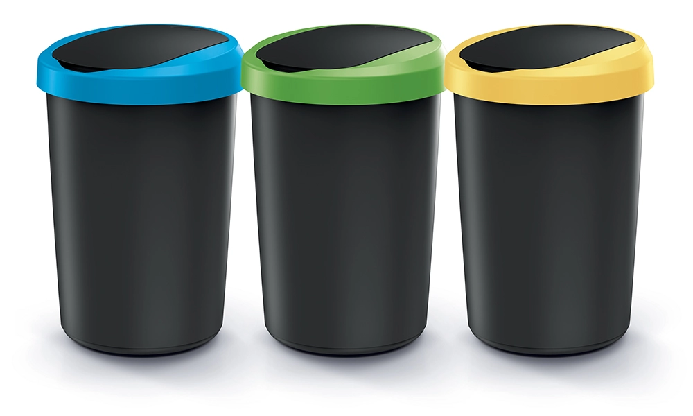 Praktikus szelektáló hulladékgyűjtő szett otthonra és irodába. Három különálló, 40 literes tartály, strapabíró, újrahasznosított műanyag és színkódolt fedelek (kék/papír, zöld/üveg, sárga/műanyag) a könnyű és környezetbarát szelektáláshoz. Kompakt méretek és modern megjelenés, amely illik bármely belső térhez.