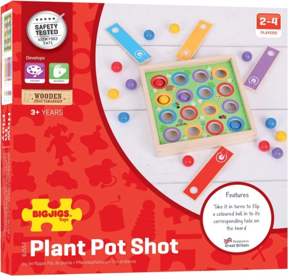 Szórakoztató családi játék 3 éves kortól, amely fejleszti a finommotorikát, a figyelmet és a kéz–szem koordinációt. A cél, hogy az indítók segítségével a színes golyókat a táblán lévő megfelelő nyílásokba lőjük. Játék 2–4 játékos számára piros, kék, sárga és lila színben. Felelősen beszerzett fából készült, és megfelel az európai biztonsági szabványoknak.