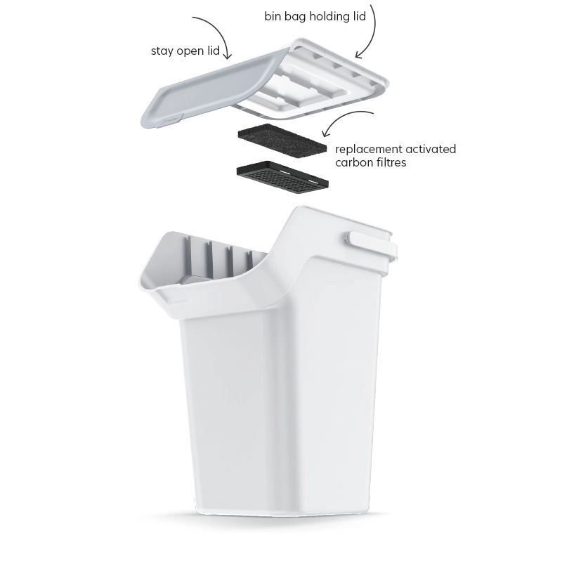 A fedél alatt aktívszén-szűrő található, amely hatékonyan elnyeli a kellemetlen szagokat, frissen tartva az otthont. A praktikus ergonomikus fogantyú megkönnyíti a hordozást és a karbantartást, míg a fedél, amely teljes felnyitáskor nyitva marad, kényelmesebbé teszi a mindennapi használatot.