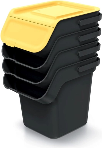 Praktikus 4×20 l űrtartalmú, négy darabos kukaszett a kényelmes háztartási szelektáláshoz. Újrahasznosított fekete műanyag, színes fedélfülek a gyors tájékozódáshoz és egymásra rakható kialakítás a helytakarékosságért. Minden kuka cserélhető aktívszén-szűrővel rendelkezik a szagok ellen és belső kerettel a zsák stabil rögzítéséhez.