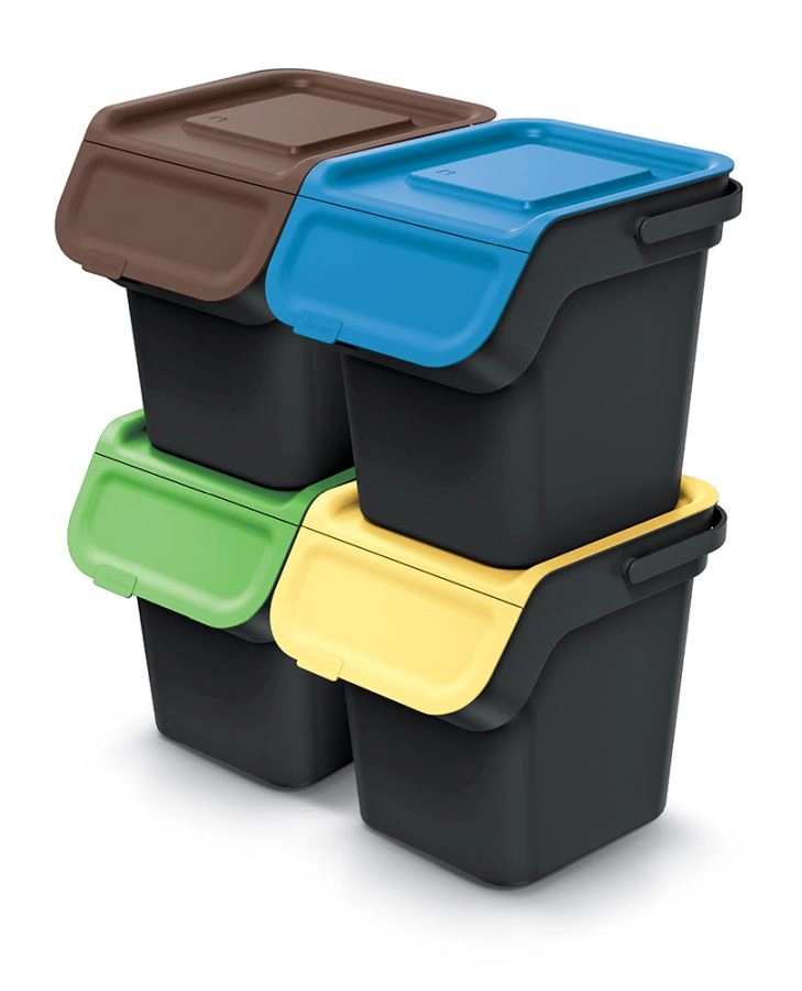 Négy kuka színben eltérő fedelekkel (barna, kék, zöld, sárga) a gyors eligazodásért hulladékválogatás közben.
