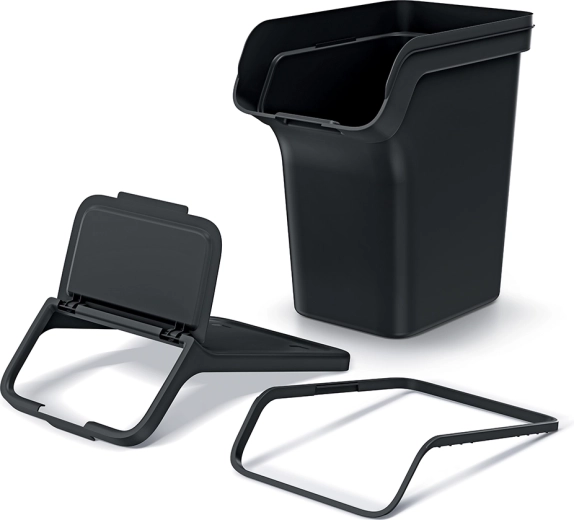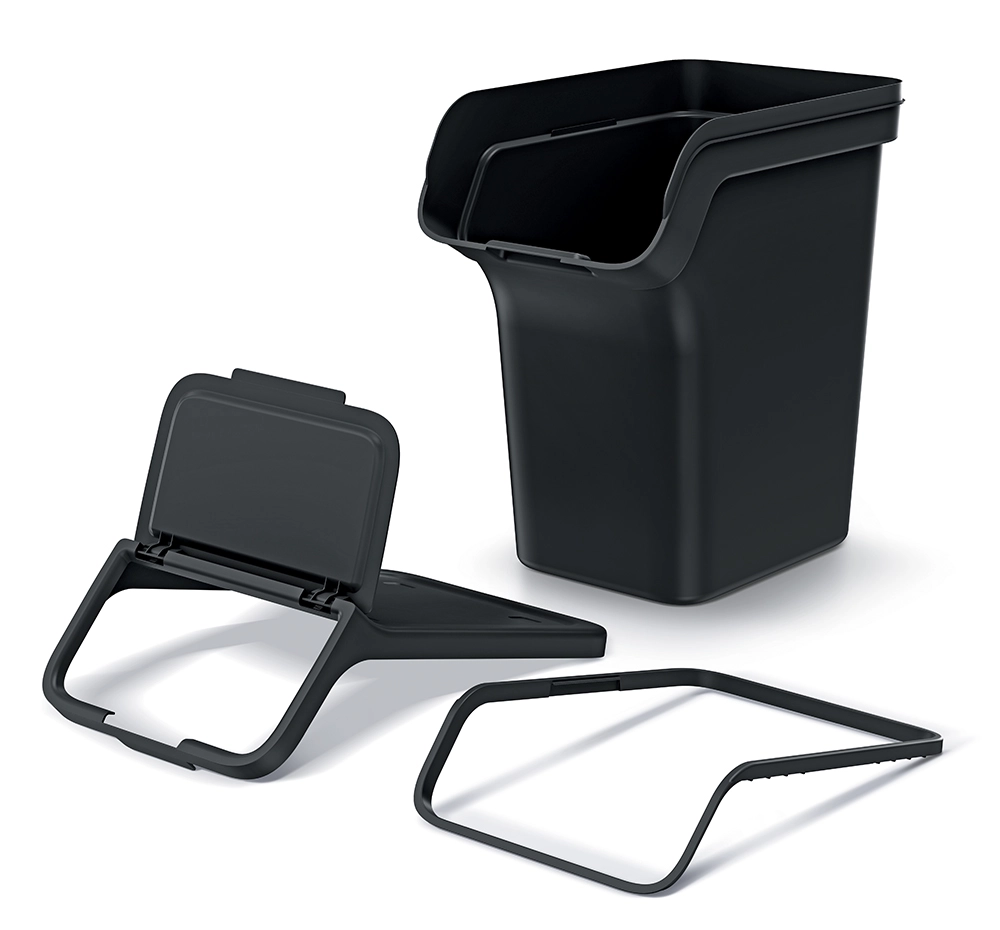 Minden kuka újrahasznosított fekete műanyagból készül, amely ellenáll a mindennapos igénybevételnek. Belül kivehető keret található a zsák rögzítéséhez, ami megkönnyíti a cserét és tisztán tartja a belsőt. Karcsú méreteinek köszönhetően a szett remekül illik konyhába, kamrába, irodába és kisebb üzemi terekbe.