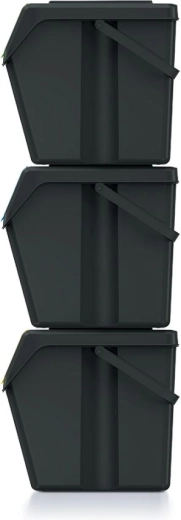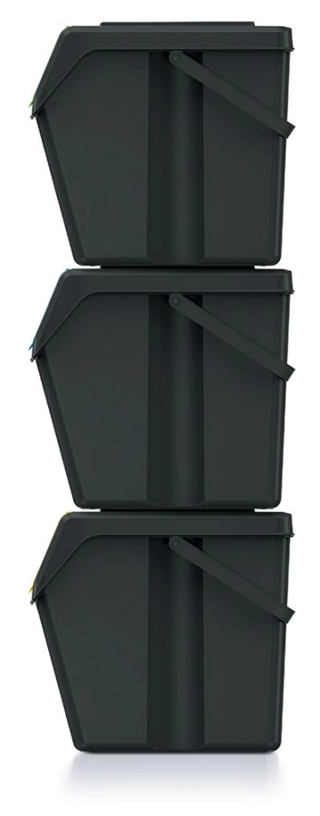 A Prosperplast SORTIBOX II háromrészes szelektív hulladékgyűjtő készlete helytakarékos, könnyen egymásra rakható, és a kényelmes kezelhetőséget a fogantyúknak, valamint a színes füllel ellátott felnyitható fedeleknek köszönheti. Minden egyes, 25 l űrtartalmú kosár strapabíró műanyagból készült újrahasznosított fekete színben, a csomagban pedig matricák is találhatók a hulladéktípusok jelöléséhez, így a szelektálás áttekinthető és intuitív.