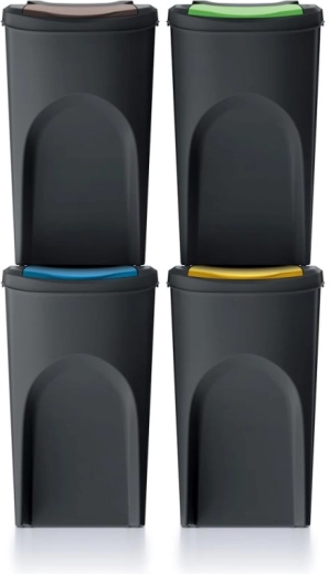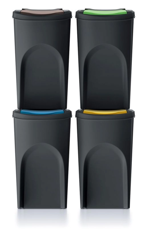 A Sortibox szett okos megoldás az átlátható és higiénikus szelektáláshoz. Minden tartálynak külön fedele és ergonomikus fogantyúja van, így a kezelés gyors és tiszta. A moduláris forma lehetővé teszi a dobozok szabad kombinálását és egymásra rakását magasságban és szélességben egyaránt, hogy pontosan illeszkedjenek konyhájába, kamrájába vagy háztartási helyiségébe.