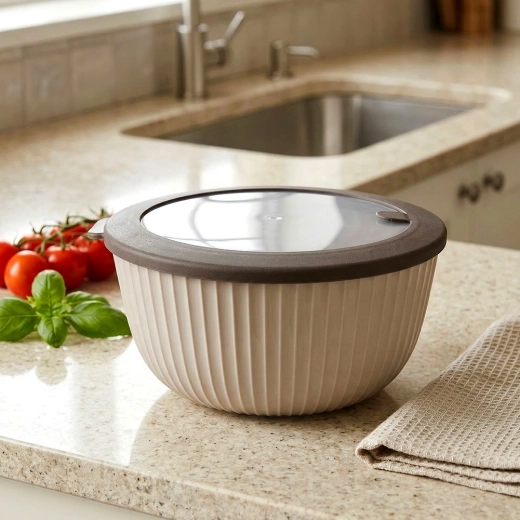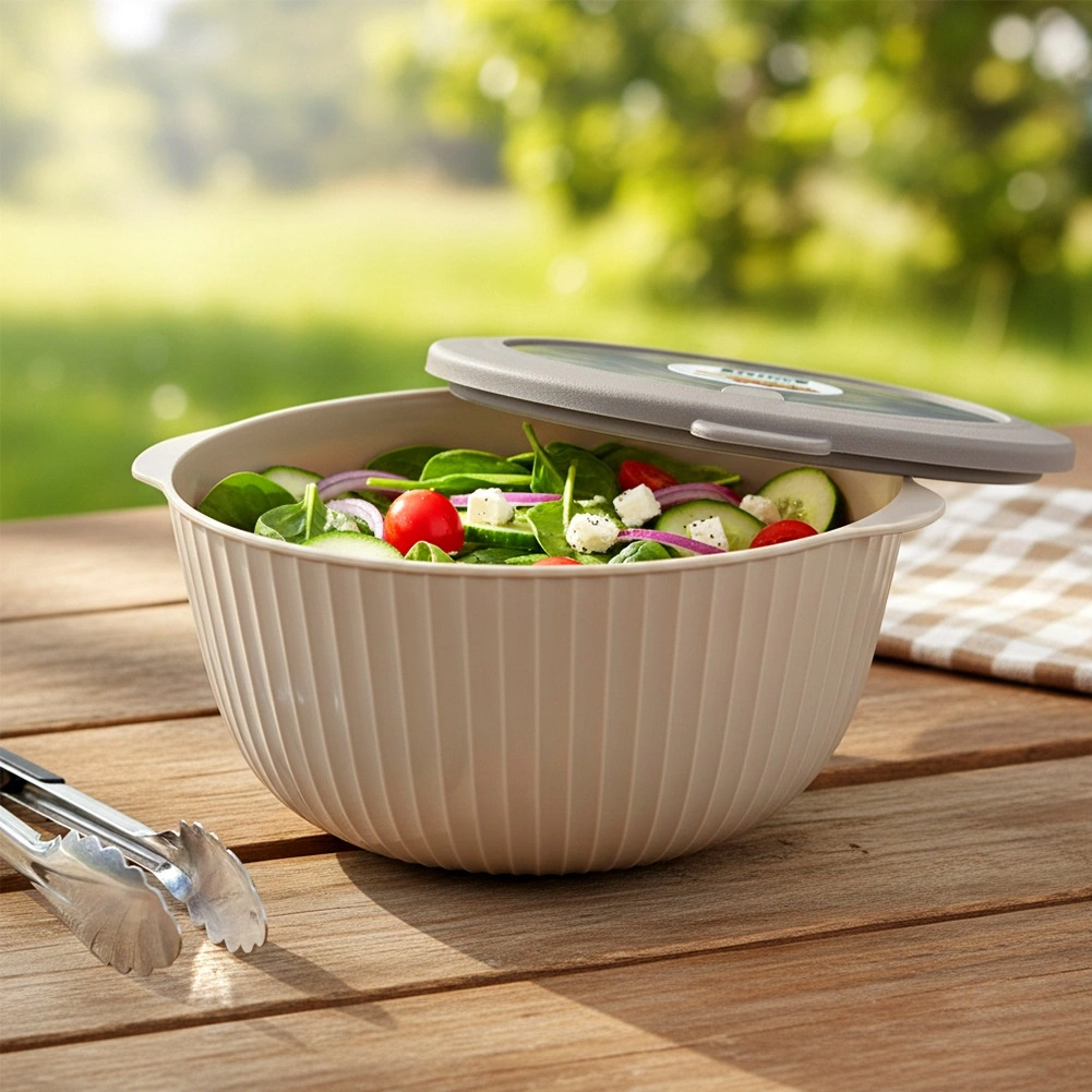 Ez az univerzális tál praktikus fedővel a 2,5 l nagy űrtartalmat biztonságos és kényelmes használattal ötvözi. A fedő átlátszó ablaka lehetővé teszi a tartalom ellenőrzését, az integrált szellőzőnyílás pedig rendetlenség nélkül biztosítja a biztonságos melegítést a mikrohullámú sütőben. A tömítő gyűrűnek köszönhetően a fedő jól illeszkedik, és segít megőrizni az ételek frissességét.