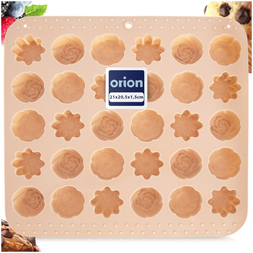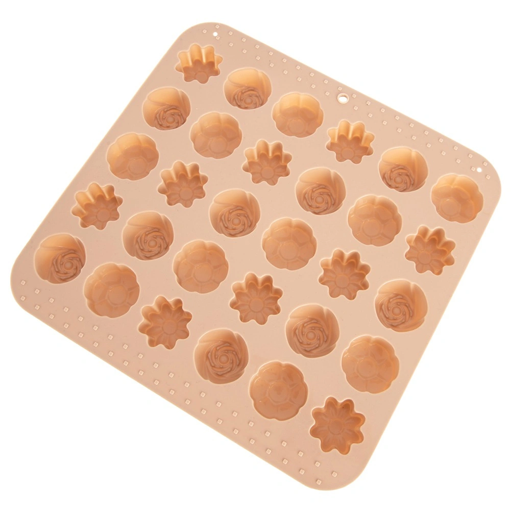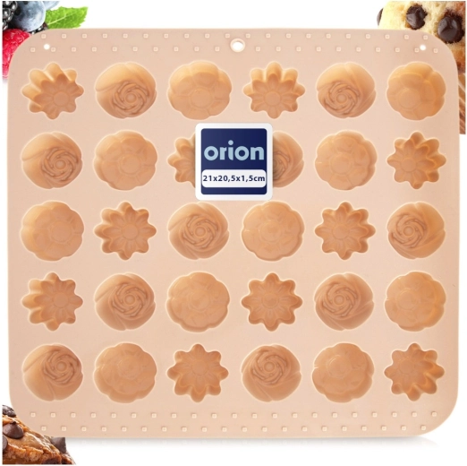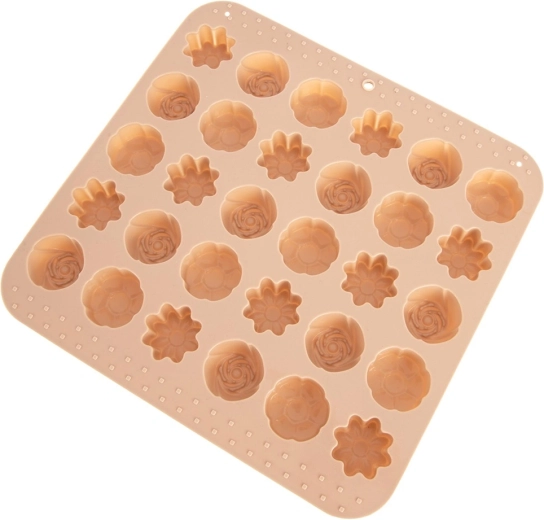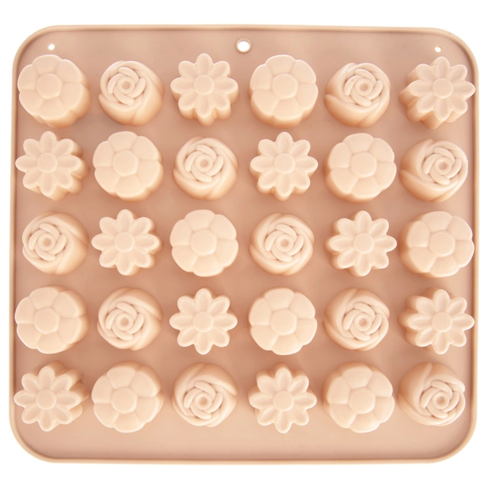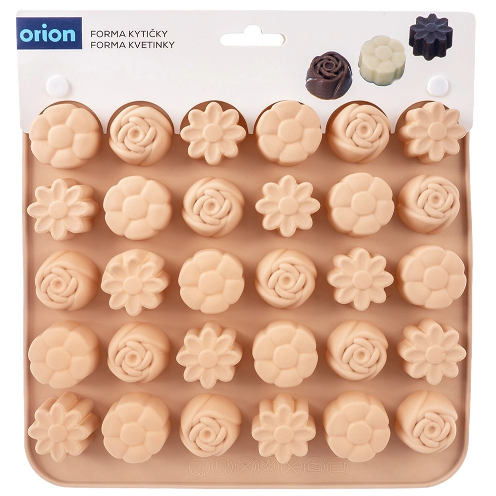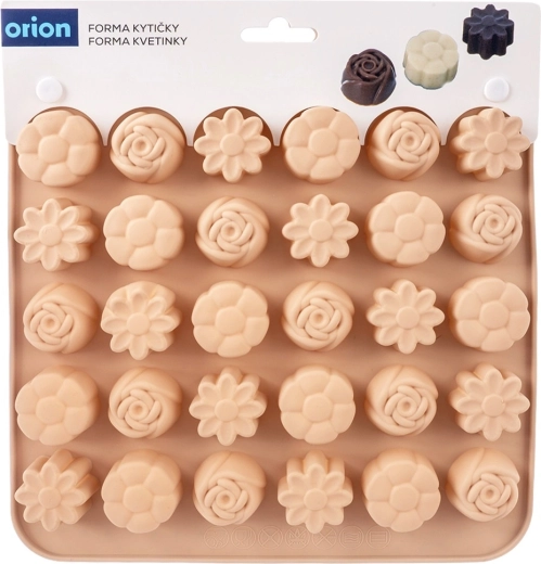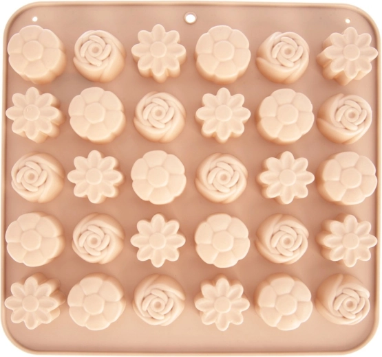 Ez a sokoldalú, bézs színű szilikon forma megkönnyíti a házi pralinék, csokik és apró sütik készítését. 3 különböző virágminta és összesen 30 mélyedés áll rendelkezésre, így könnyedén készíthet látványos vendégvárót és ehető ajándékokat. A rugalmas és tapadásmentes anyagnak köszönhetően a kész darabok kenés nélkül is könnyen kifordíthatók.