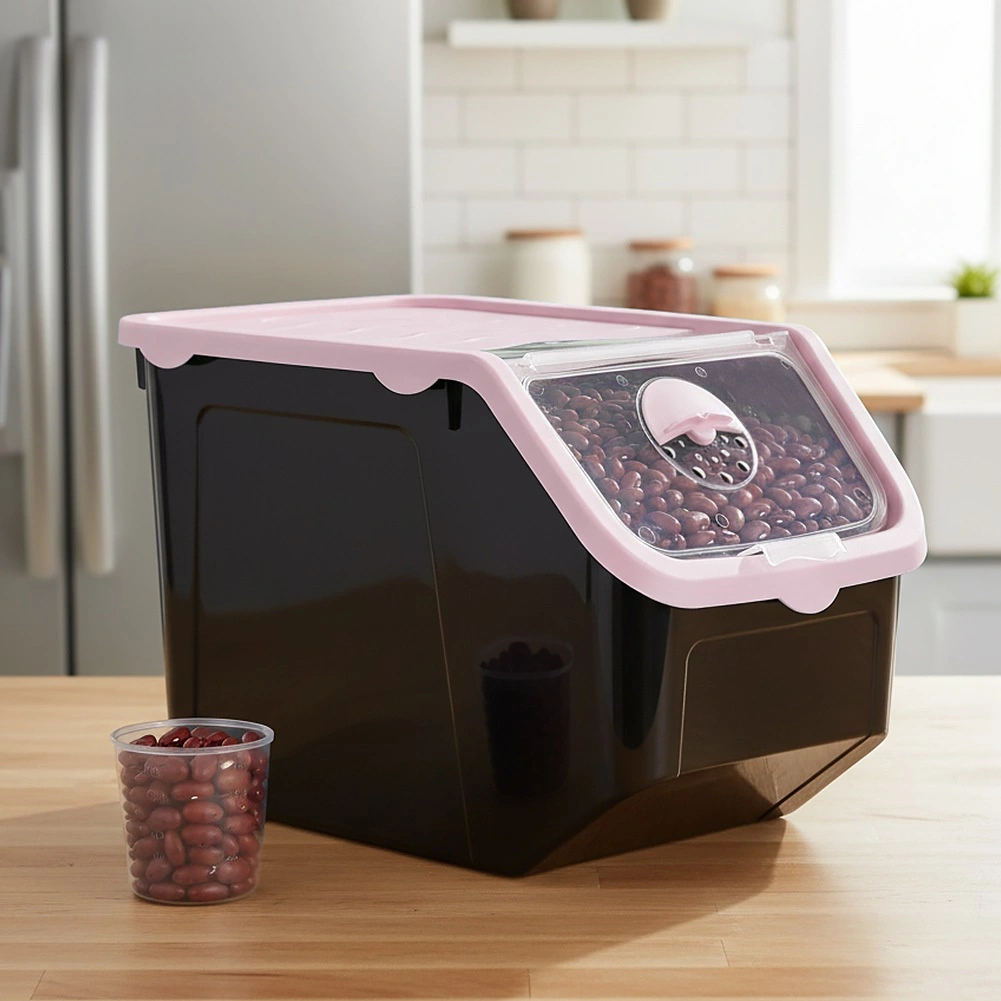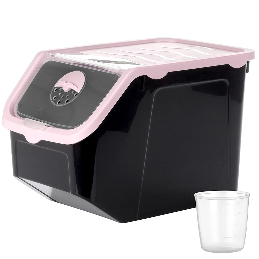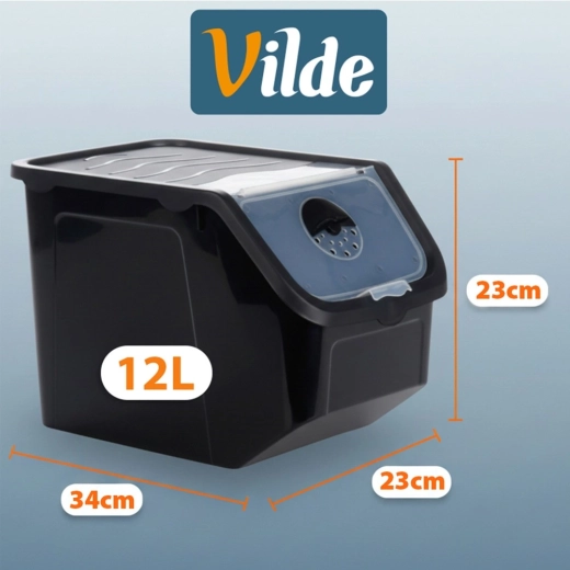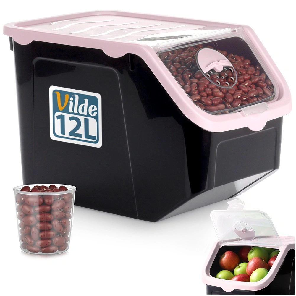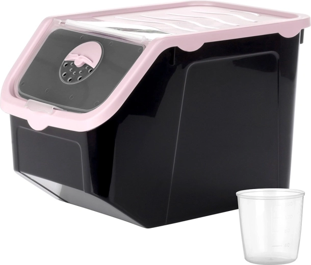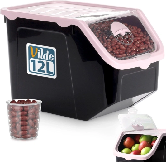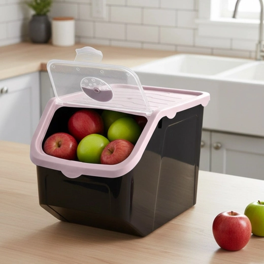 Praktikus, fekete, strapabíró műanyag tartály rózsaszín fedéllel, ideális hagyma, burgonya, fokhagyma, gyümölcs és szóródó élelmiszerek (hüvelyesek, állateledel, porok) tárolására. Az átlátszó elülső billenőajtó gyors betekintést és kényelmes adagolást biztosít, a fedél résnyire nyitható vagy teljesen levehető. Az anyag élelmiszerbiztonságos, BPA-mentes, és ellenáll a -20 °C-tól 100 °C-ig terjedő hőmérsékleteknek.