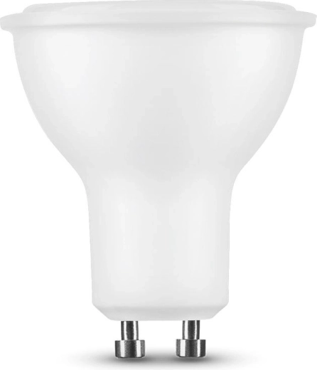 A széles, 100°-os sugárzási szög egyenletes fényeloszlást biztosít, ezért alkalmas gipszkarton álmennyezetekbe, fal- és asztali lámpatestekbe GU10 foglalattal. A 6000 K – hideg fehér fény kiemeli a részleteket, és jól használható konyhákban, dolgozószobákban, folyosókon vagy kereskedelmi terekben. A CRI >80 színvisszaadási index természetes színmegjelenítést nyújt a beltérben.