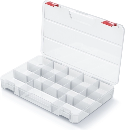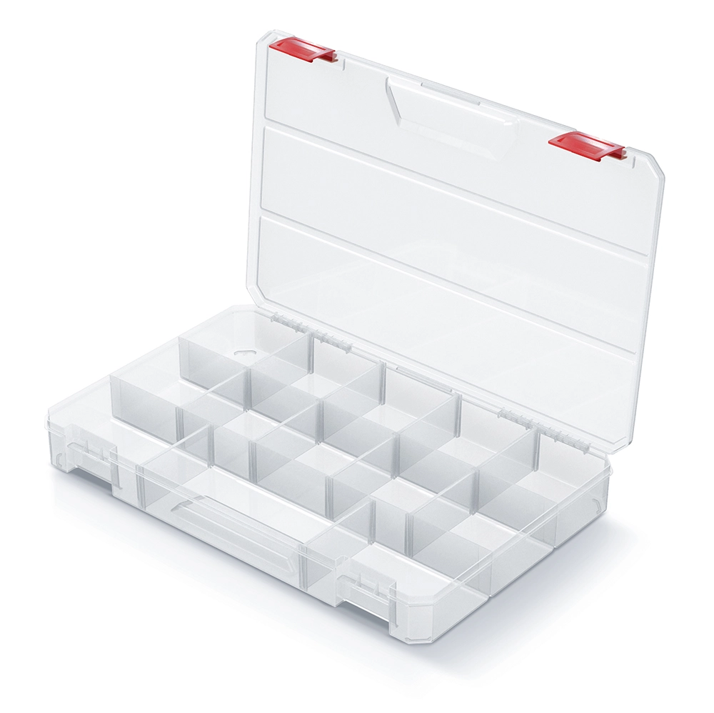 A 11 rekesznek és a 8 kivehető modulnak köszönhetően könnyedén az aktuális igényekhez igazíthatja a belső elrendezést. A könnyű, mégis strapabíró műanyag konstrukció a masszív zárakkal együtt biztosítja az apró alkatrészek biztonságos tárolását és szállítását.