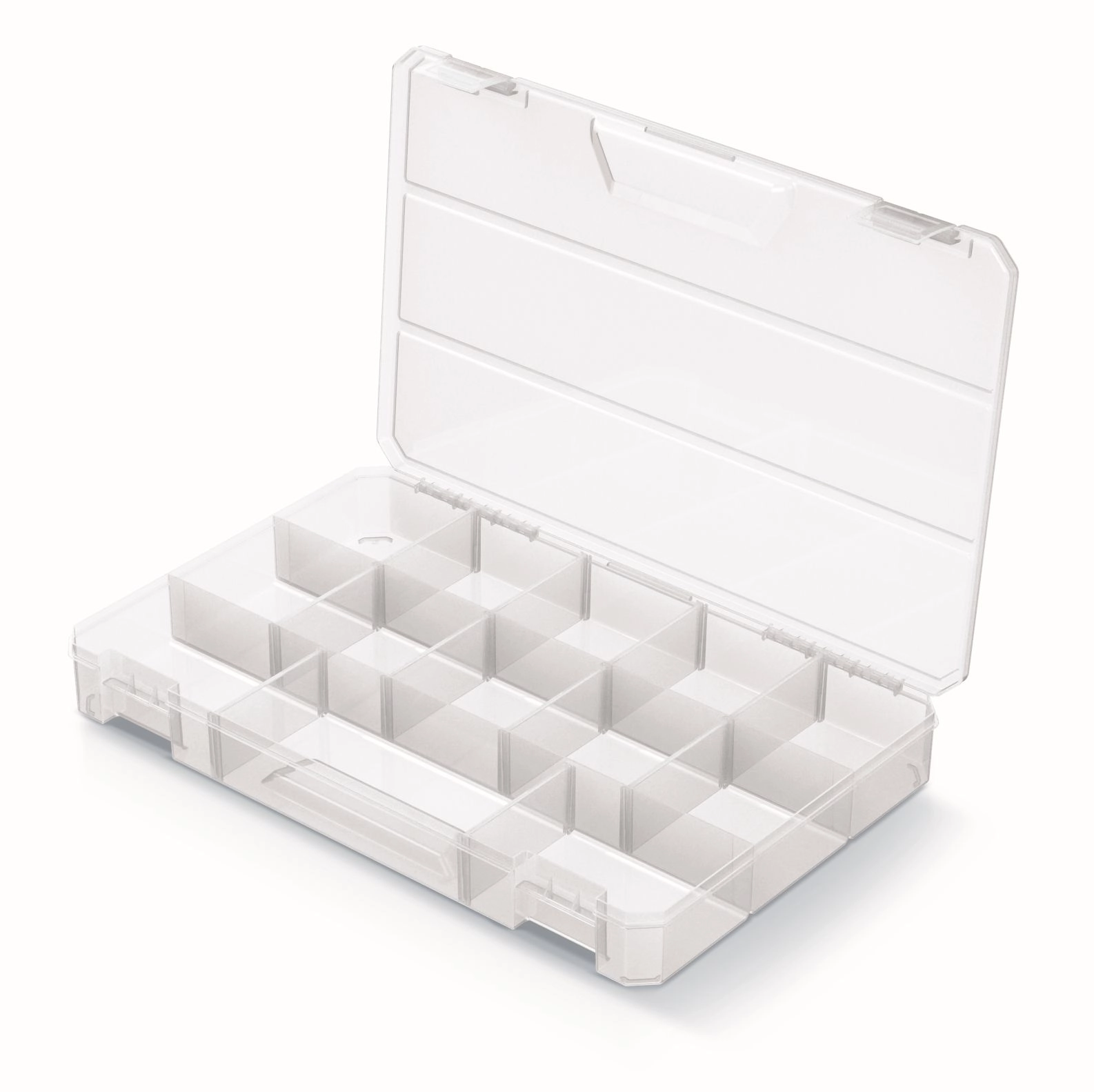 A praktikus SQR BOX rendszerező 35,5 × 23 × 4,1 cm méretben ideális csavarok, szegek és egyéb apróságok áttekinthető tárolására. A átlátszó fedélnek és testnek köszönhetően a tartalom azonnal látható, felnyitás nélkül. 10 kivehető válaszfalat kínál a rugalmas elrendezéshez, akár 13 rekesszel, valamint biztonságos zárást két masszív műanyag zárral. Könnyű, strapabíró kialakítása és a stócolhatóság helyet spórol a műhelyben, garázsban és az építkezésen is.