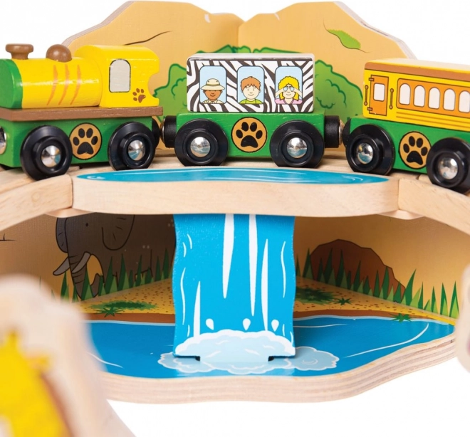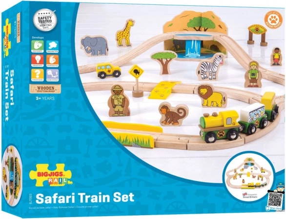 Fedezd fel a szafari világát ezzel a színes, masszív fa vonatpályával, amely 3 éves kortól örömet szerez. A szettben olyan állatok vannak, mint elefánt, zebra és majom, továbbá fák, táblák és egy híd, amelyen egy sárga mozdony két kocsival halad át. A mágneses kapcsolóknak köszönhetően a játék intuitív és könnyen bővíthető.