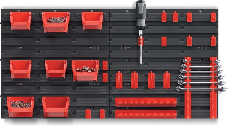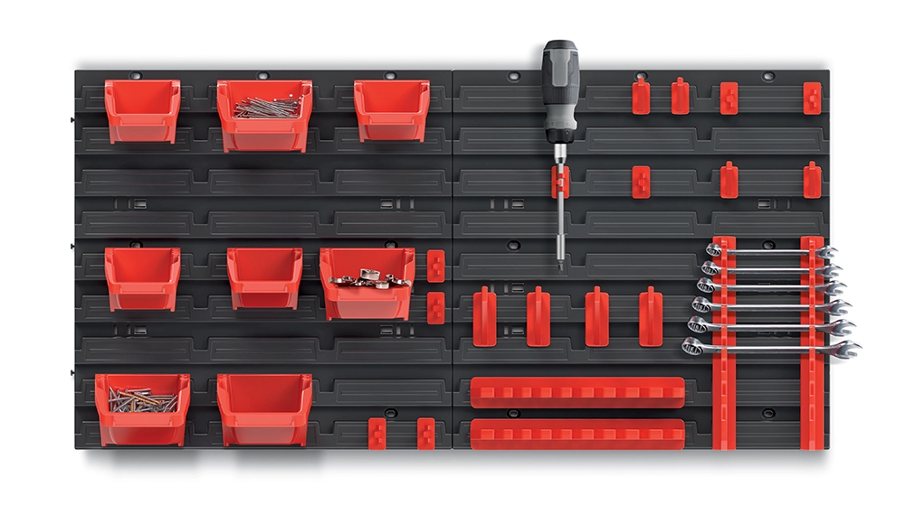 Tartson rendet és biztosítson gyors hozzáférést a szerszámokhoz az átgondolt fali rendszerezővel. A panel kombinálja az apró anyagoknak szánt tárolódobozokat és a szerszámok felakasztására szolgáló kampókat, így mindent egy helyen, áttekinthetően tarthat. A robusztus műanyag ellenáll a mindennapos használatnak, a fekete–piros kivitel pedig professzionális megjelenést ad a műhelynek.