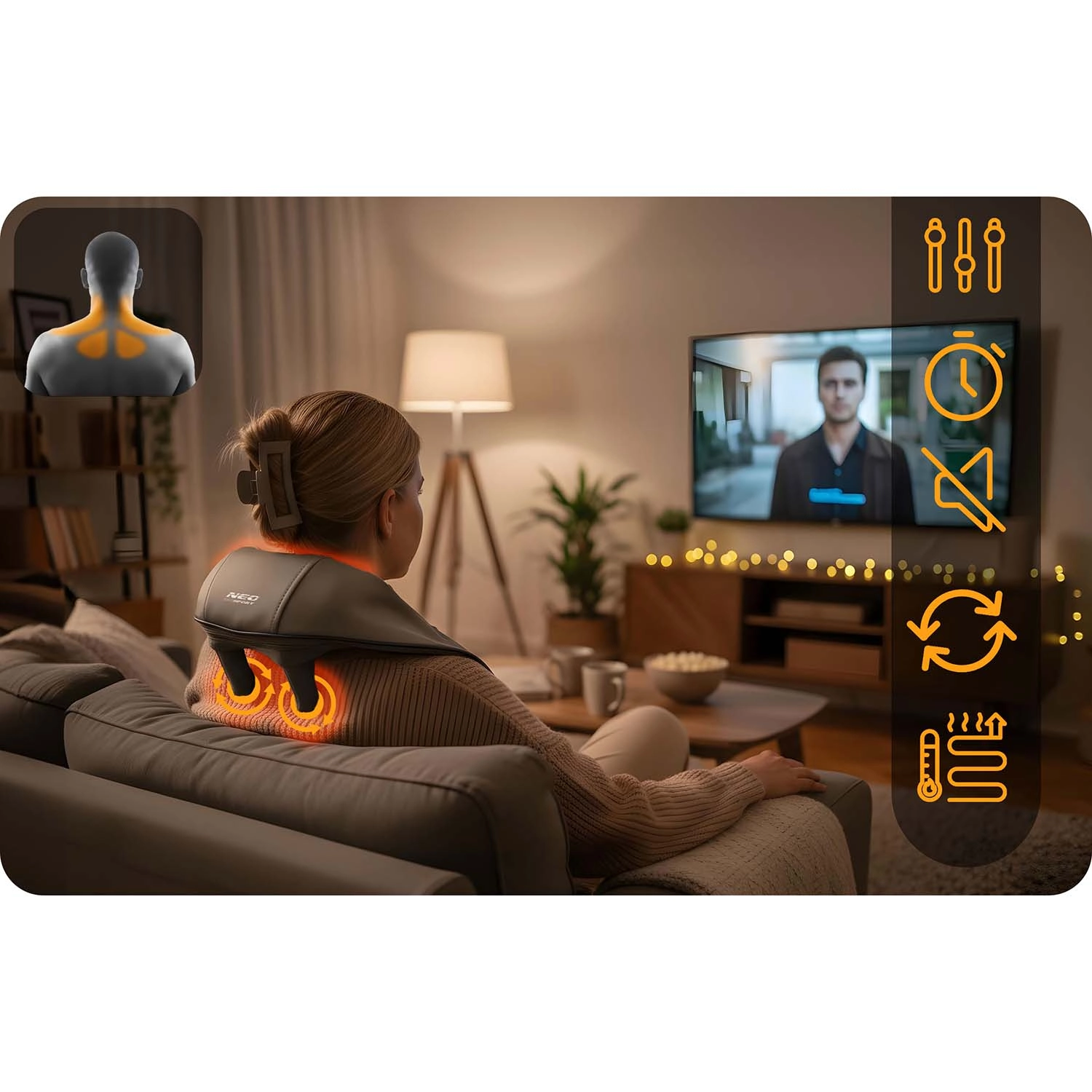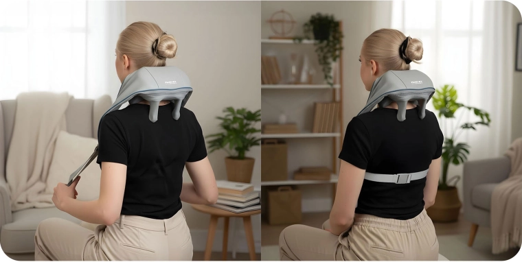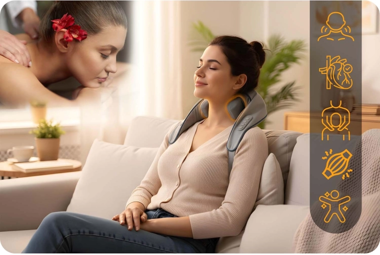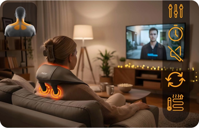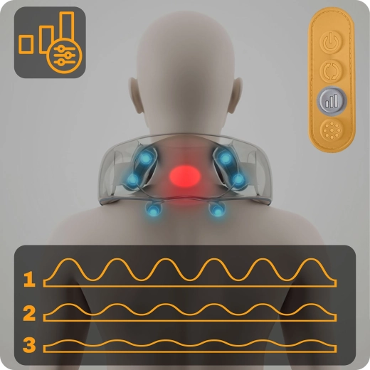 A masszázscsomók több irányban forognak, és a kézi érintést utánozzák. Célzottan lazítják a nyak, tarkó és hát merev izmait, enyhülést hozva fájdalom és stressz esetén.