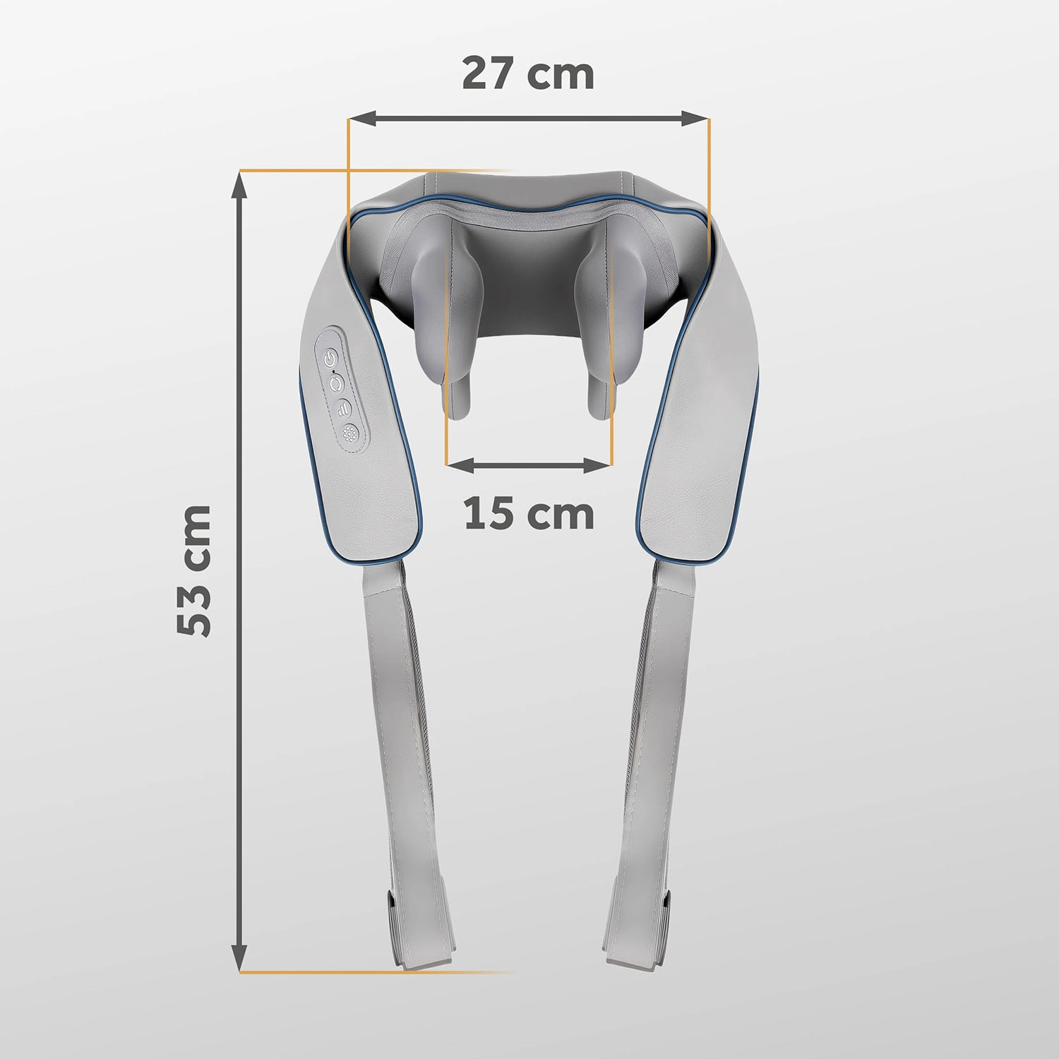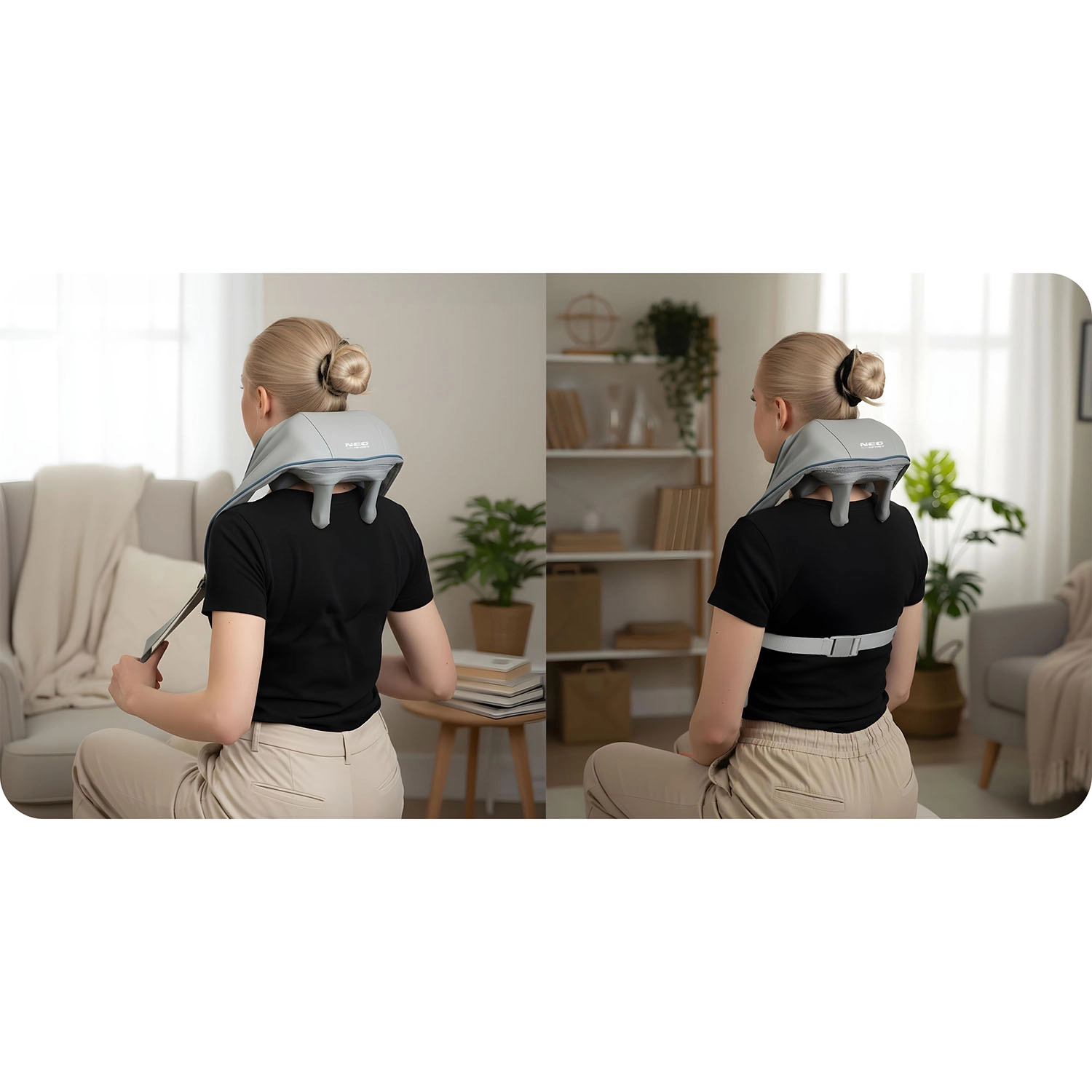 Az intuitív panel egyetlen érintéssel engedi váltani a 3 intenzitási szintet, a forgásirányt és a melegítést. A állítható pántoknak köszönhetően könnyen szabályozható a nyomás – kézzel meghúzva vagy a hátsó pánttal hands‑free relaxhoz. Ideális a nyak és tarkó, vállak, hát és derék, valamint a combok és vádlik masszírozására sport után vagy hosszas ülés esetén.
