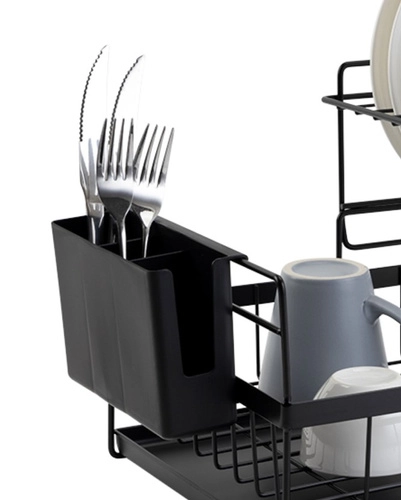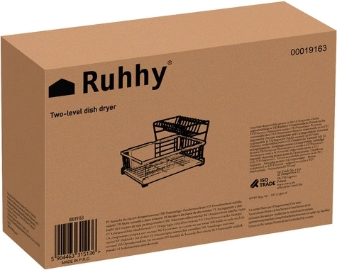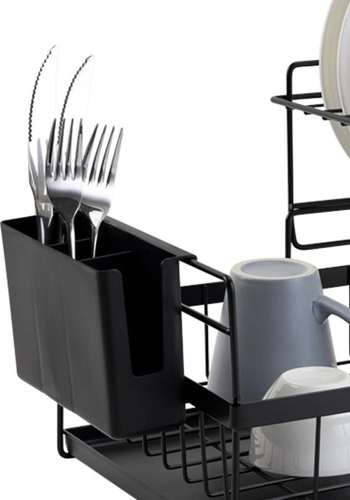 A praktikus, kétszintes RUHHY edényszárító hatékonyan használja ki a helyet: a felső szint függőlegesen tartja a tányérokat, az alsó ideális a tálak, poharak és csészék számára. A kivehető evőeszköztartó rendszerezetten kéznél tartja a kanalakat, villákat és késeket. A lapos tálca felfogja a vizet, így a konyhapult száraz marad.