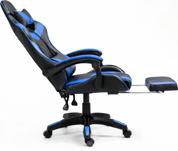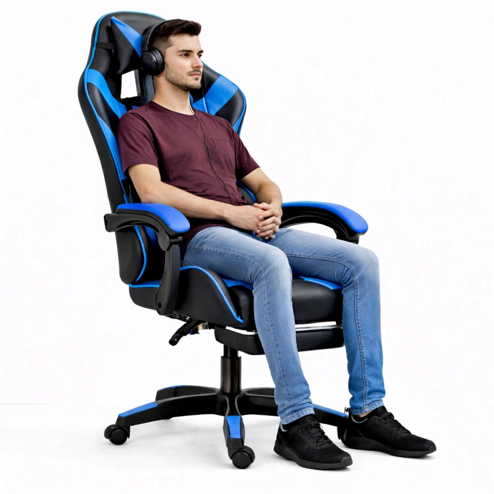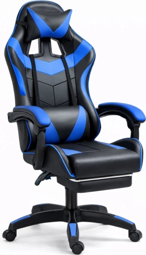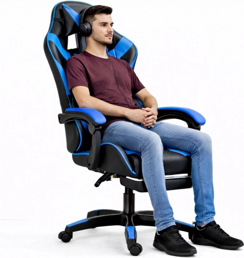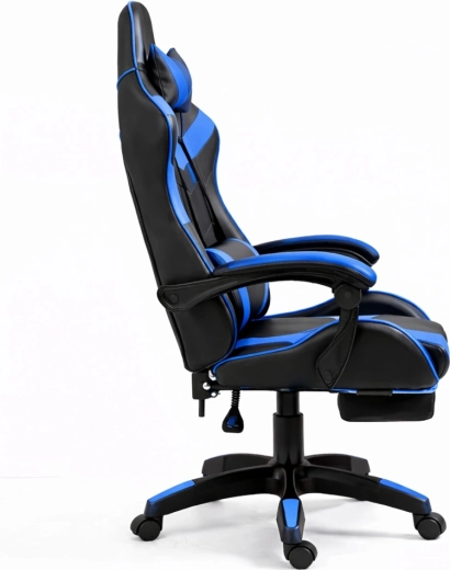 Az ergonomikus LEAN gamer szék elegáns fekete–kék kivitelben magas háttámlával fej- és deréktámasszal, 135°-ig dönthető háttámlával, magasságállítással és kihúzható lábtartóval kínál maximális kényelmet játékhoz és munkához. Tartós ökobőr, 360°-ban forgatható talp és stabil ötágú csillagtalp görgőkkel gondoskodik a kényelemről és a könnyű mozgásról hosszan tartó ülés közben is.