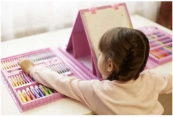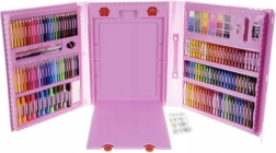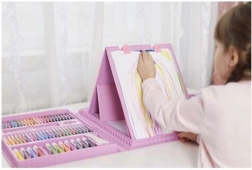 A készlet 208 darabot tartalmaz, beleértve a filctollakat, pasztell és viasz ceruzákat, akvarell festékeket és sok más kelléket.